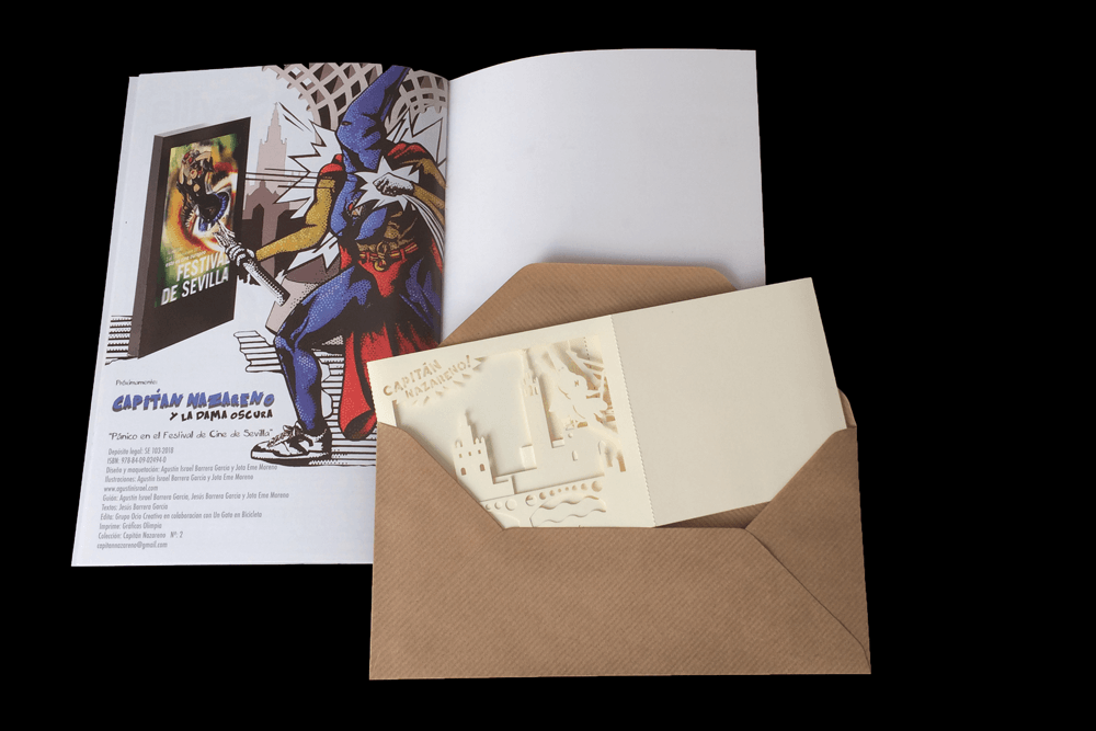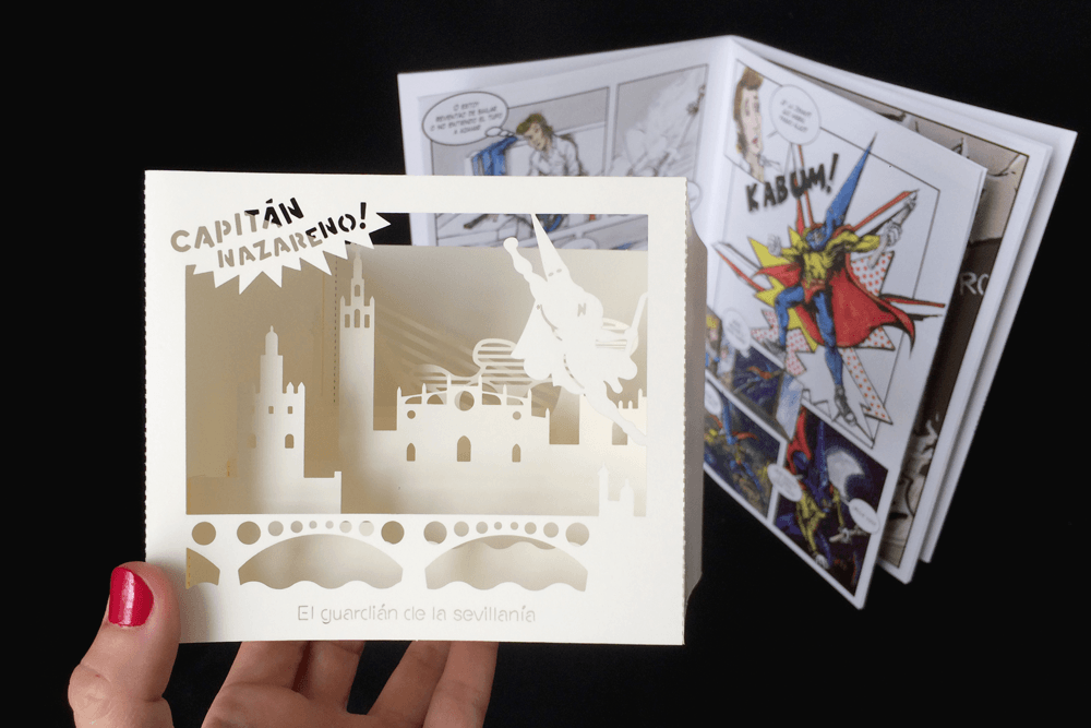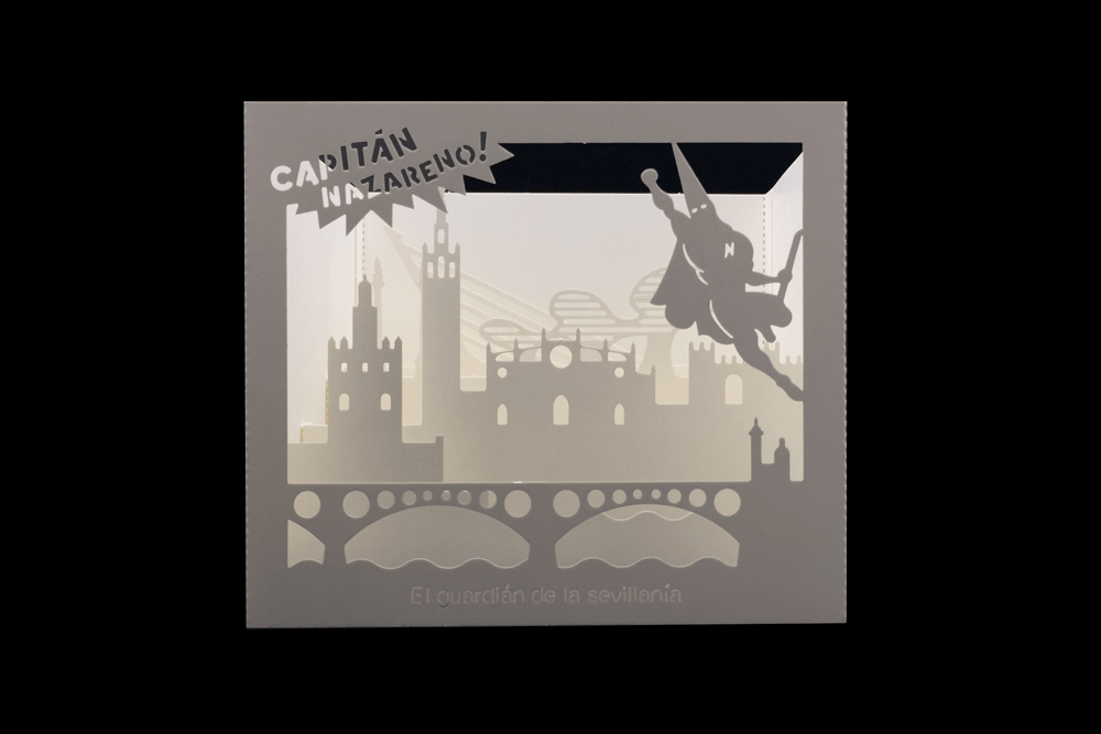 Nuestro querido amigo Agustín Israel Barrera, el creador del Capitán Nazareno, nos pidió un diseño que sirviera para acompañar el segundo número del comic de este entrañable personaje. Así que perfilamos la poderosa silueta del Guardián de la Sevillanía, nuestro superhéroe local favorito, volando sobre la ciudad.