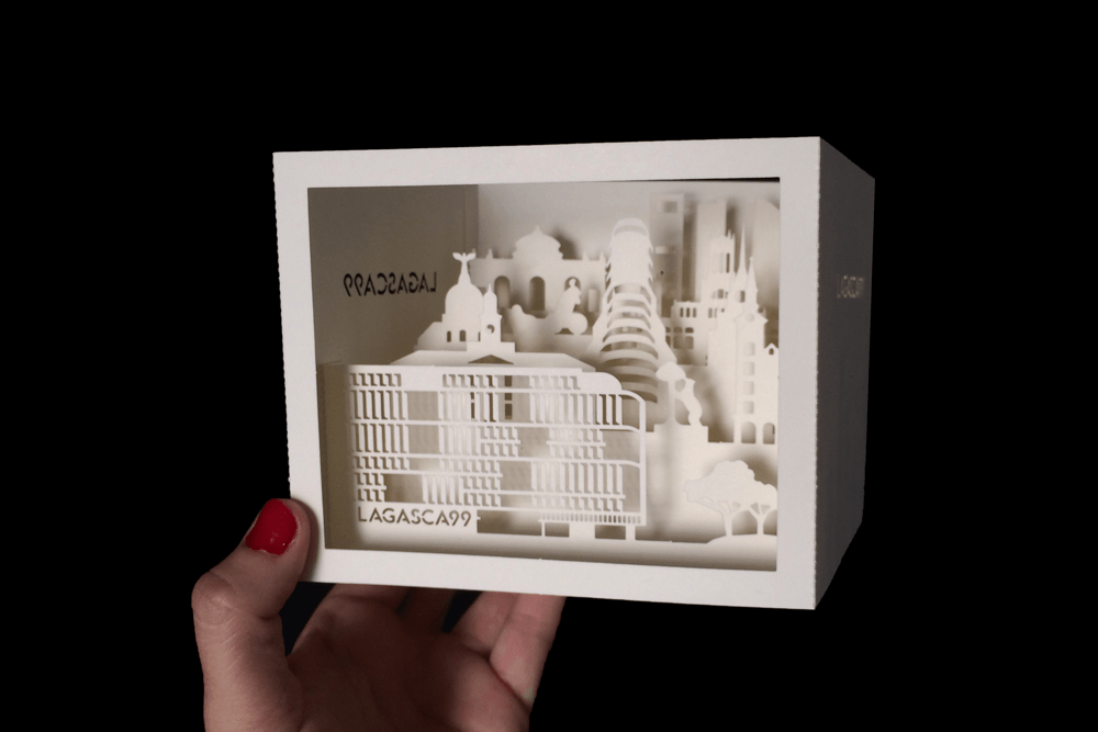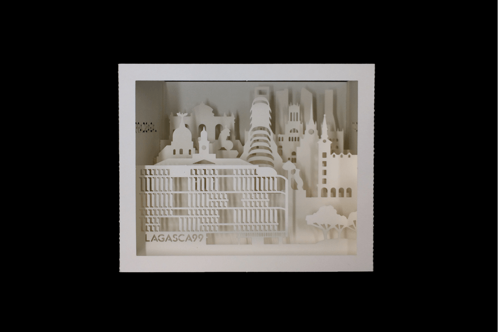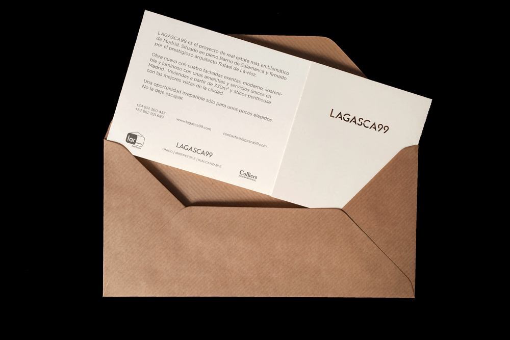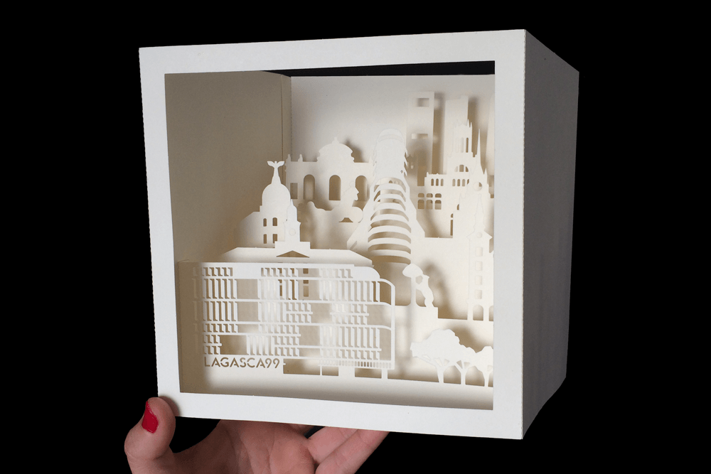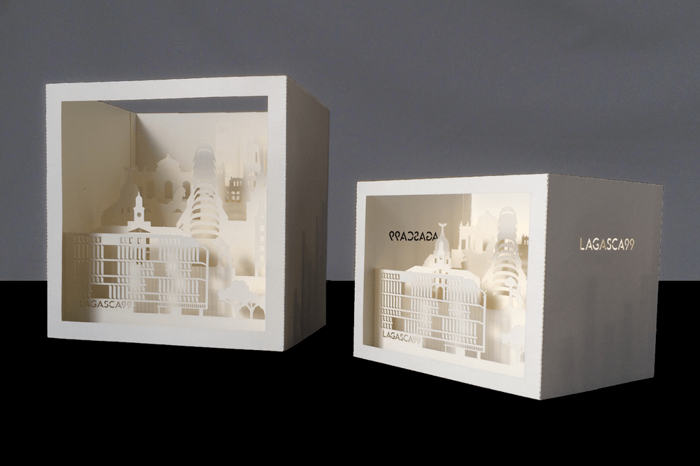 Los promotores del edificio de viviendas más lujoso y exclusivo de Madrid necesitaban un producto único, moderno, elegante y distinguido para promocionar su proyecto entre los inversores de una feria inmobiliaria de Miami. Además, debía ser fácilmente transportable por los agentes comerciales al extranjero. Para ello diseñamos una exclusiva encaja gigante en el que la silueta del edificio se destacara entre los monumentos más significativos de la ciudad. Su característica fachada queda sutilmente representada en la cartulina recortada en esta visión urbana de un concepto irrepetible.